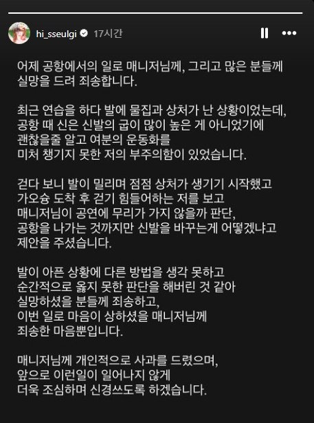 발이 아픈 상황에 다른 방법을 생각 못하고 순간적으로 옳지 못한 판단을 해버린 것 같아 실망하셨을 분들께 죄송하고, 이번 일로 마음이 상하셨을 매니저님께 죄송한 마음뿐입니다.