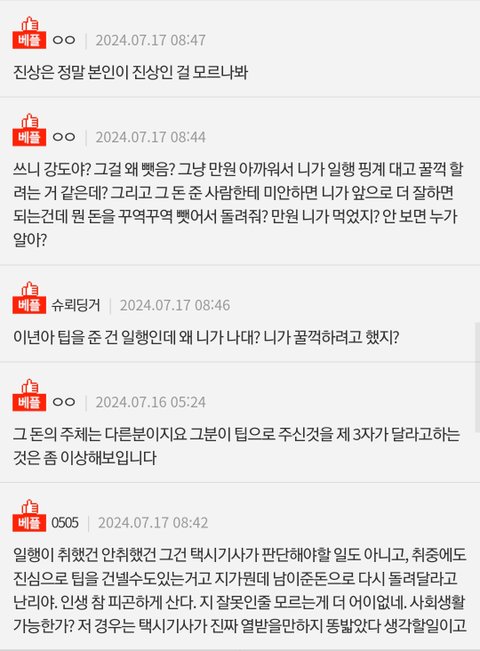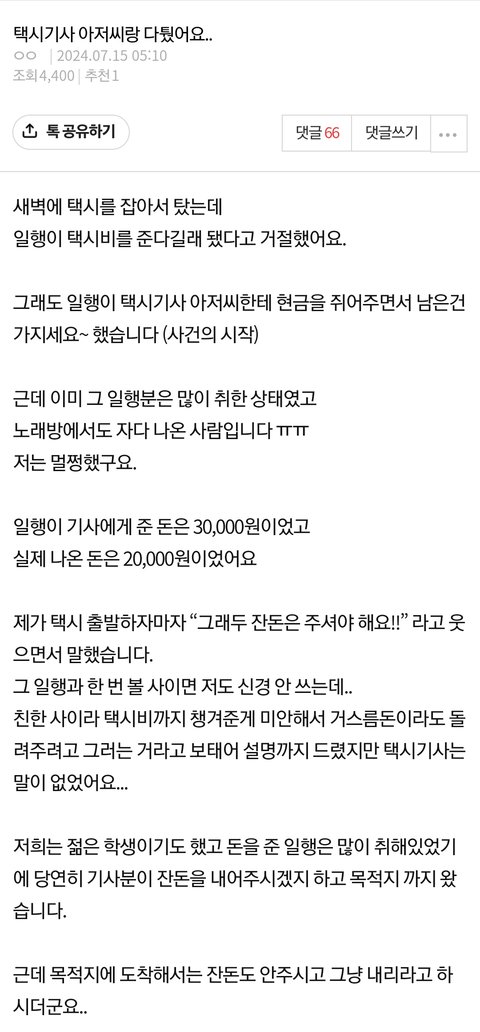 일행이 술 취한 일행이 택시기사님께 미리 택시비로 3만원을 드렸는데 2만원이 나와서 만원 내놓으라고 함