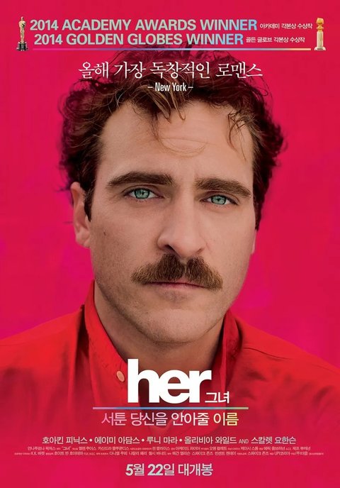 제86회 아카데미 시상식 각본상 수상작 / 작품상, 음악상, 주제가상, 미술상 후보작이다.테오도르는 다른 이들의 사랑 편지를 대신 써주는 일을 하며 살지만, 정작 자신은 아내 캐서린과 별거한 후 외로움과 공허함에 빠져있다. 캐서린이 요구하는 이혼 서류에 사인하기를 1년 넘게 미루던 그는 어느 날, 인공지능 운영체제 사만다를 만나면서 완전히 새로운 일상을 맞이하게 된다.