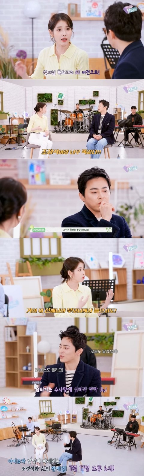 아이유는 "거의 뭐 선배님의 부모님께서 들으셔도 조정석이 아닐까"라고 밝혔다. 반박하기 어려운 아이유의 이야기에 조정석은 "연락이 많이 오더라"며 당황의 미소를 감추지 못 했다.