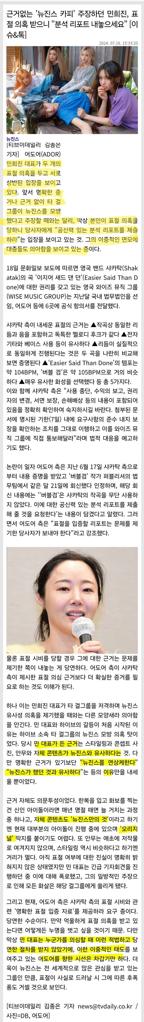 맞말 아님? 본인이 다른 팀한테 표절 주장할 때는 포뮬러를 카피했다, 민희진풍, 민희진류, 뉴진스의 아류다 이랬으면서 본인이 원곡자한테 표절 의혹 받으니까 되려 분석리포트 제출해서 증명해라 이러네ㅋㅋㅋㅋㅋㅋ 우스운 건 맞잖아ㅋㅋㅋㅋㅋㅋㅋ