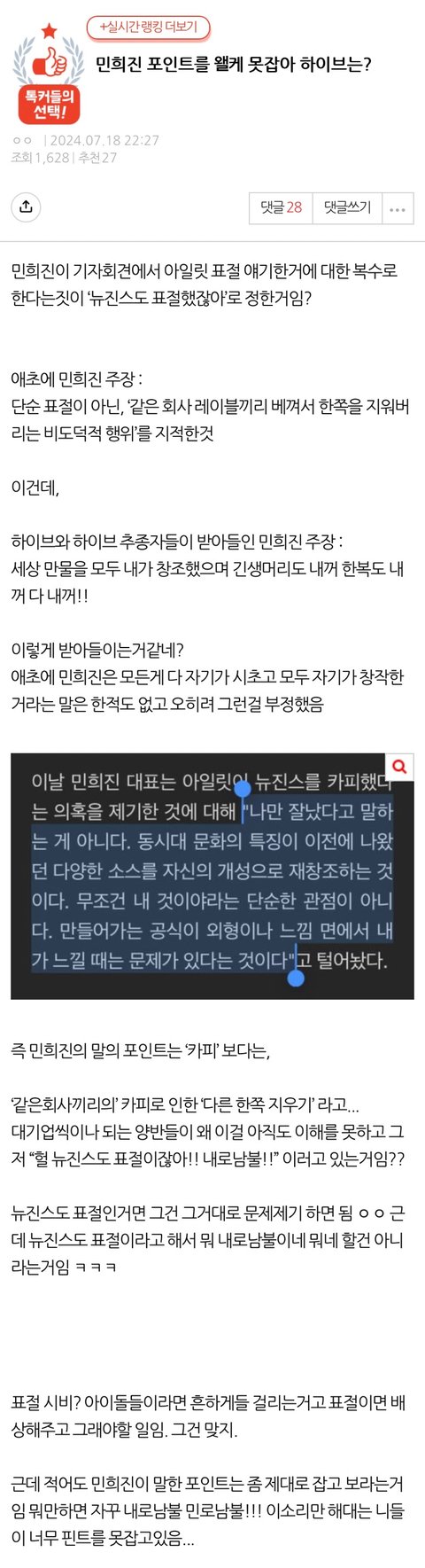민희진도 본인이 카피 주장할때 하이브에 내부항의 하면서 다 증거 자료들 낸거 아님? 그럼 회사에 항의서 내는데 말로만 “카피하지 마세요” 이랬겠음? ㅋㅋㅋ 민희진도 마찬가지로 뭐가 왜 카피라는건지 정리해서 항의했을테고 기자회견에서도 간략하게 말했구만 뭐가 내로남불이라는거...? ㅋㅋㅋ