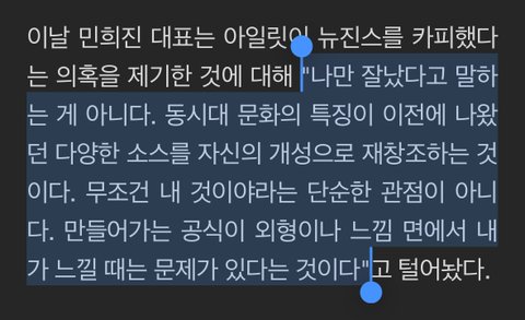 민희진은 그런말을 한적도 없고 모든게 자기 창작이라는것도 오히려 부정했어요~ 제발 니네 맘대로 왜곡해서 알아듣고 한쳐먹기좀 그만