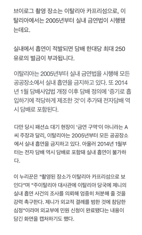 지금까지의 기사들 대부분이 제니가 실내금연법을 위반했다는 전제 하에 작성됐는데, 예를 들어 아래 내용들