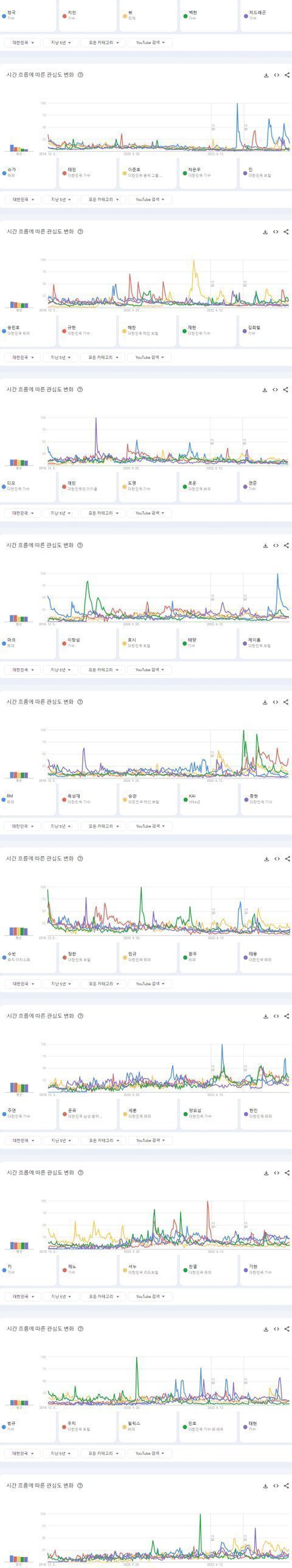 최근 5년간 한국 유튜브에서 가장 많이 검색된 남자아이돌 TOP50