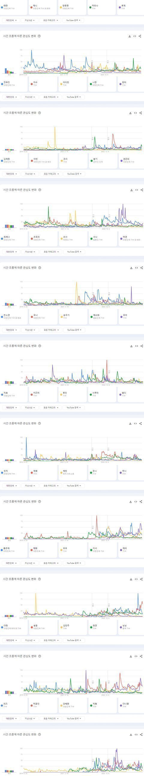 최근 5년간 한국 유튜브에서 가장 많이 검색된 여자아이돌그룹 멤버 TOP50