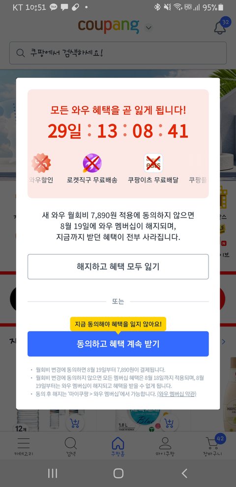 ( 그간에도 월회비인상에 동의할지 해지할지 묻는 창이 계속떳지만 나중에 선택하기 탭이 있어 이용은 가능했음)