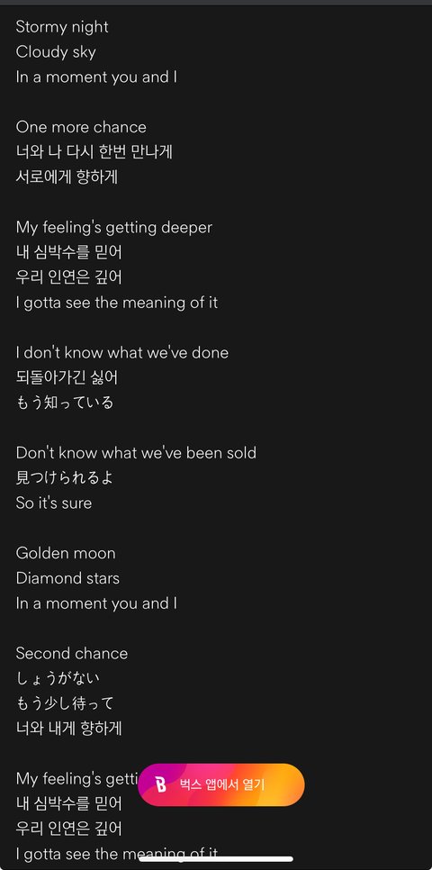 일본 데뷔곡이라길래 일본어가 많을 줄 알았는데 무슨 또 영어가 대부분임; 중간중간 한국어 끼워넣은 거 한국인들 반응 노린 건가 싶은데 난 이것도 좀 별로였어 일본 데뷔 노래면 차라리 일본어로만 구성하지 죄다 영어 일본어 찔끔 원래도 잘 안 넣는 한국어 찔끔..
