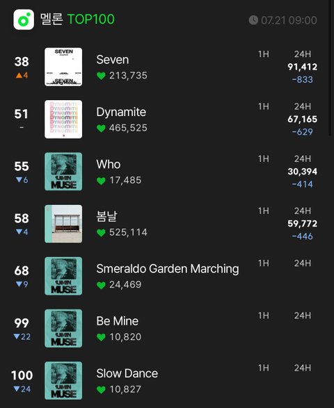 아침9시 차트인데 지민 이번앨범 6곡중 4곡 차트인중이고 타이틀은 심지어 50위권임 방탄보고 차트인못한다고 한 애들 양심있? 퇴물이라고 그만좀 나오라고 하던데ㅋㅋ 차트인 못하는 남돌도 많은데 그럼 걔들은 퇴물임? 방탄한테 억까좀 작작해ㅋㅋㅋ 요즘 차트진입하는것도 힘들어진거고 멜론이 예전처럼 쉬운줄아나봐ㅋㅋㅋ 요즘여돌말고는 대중들이 남돌노래 잘안듣기도하는데 군백기라 화력 줄어들었는데도 차트인은 한거임 심지어 멜론 탑백엔 방탄만 7곡이넘음ㅋㅋㅋㅋ