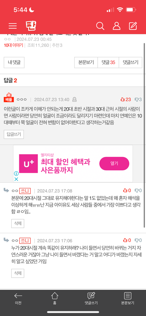 +아니 생각보다 조회수가 너무 확확늘고 내가 의도한 게 아닌 의견으로 아는 애들이 많아서 적음 난 아이유 지금얼굴도 너무너무 좋아하고 내가 화장법이나 이런 걸 잘 몰라서 단순히 나이가 먹어서 분위기가 바꼈다보단 뭐가 바꼈는지 자세히 알고 싶어서 적은 글이었음 뭐 20대모습 그대로 유지해야한다 이 말은 1도 없는데 이렇게 해석하는 애들 왤케 많아? 난 사람으로서 아이유 너무 좋아하고 제일 예쁜 것도 아이유라고 생각해 오해 ㄴㄴ..