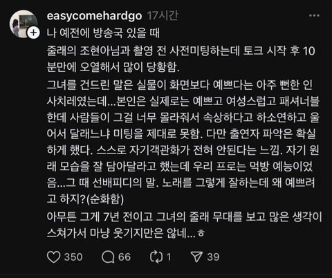 조현아는 컨셉이고 뭐고 조목밤 하면서 아이돌 친구들도 많이 보고 하니까 그런 컨셉이 하고싶었던 것 같음 남아선호사상 얘기도 많이 나오던데 걍 애초에 그런 생각이 박혀있으니까 이런 노래로 나와도 반응이 이상할줄 몰랐던거임 밑에 사진 내용도 보면 외모강박도 심하고 자존감도 낮은거같음 그런 상태에서 대중들 반응 싸늘하고 외모로 조롱까지 당하니까 멘탈 터져서 활동중지 한거같음