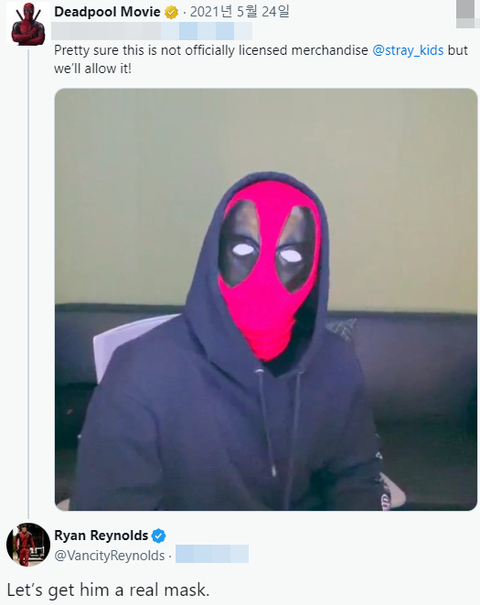 방찬이 라방에서 데드풀 비공 굿즈 쓰고 놀았는데 그걸 보고 라이언이 공식 굿즈 보내 주겠다고 함