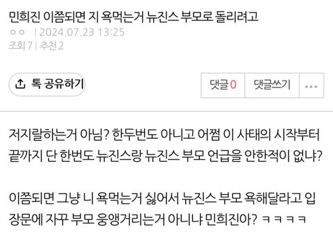 민희진 진짜 왜저래? 멤버들을 왜자꾸 끌어들여 지금 버니즈들도 민희진 욕하는중인데 민희진 정신못차리고 끝까지 멤버 붙잡고늘어지노