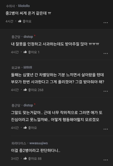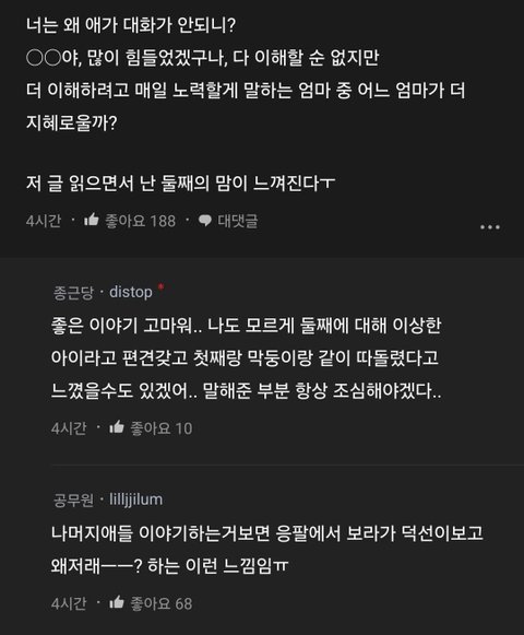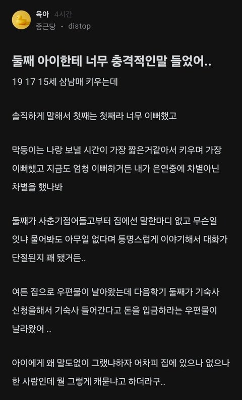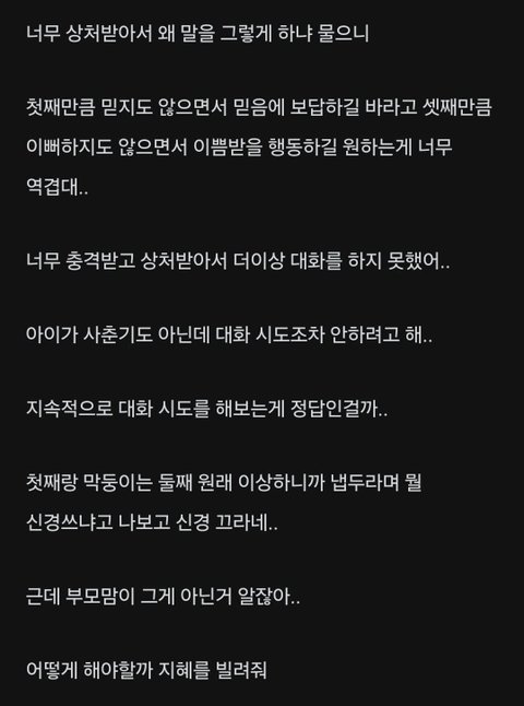 첫째,셋째가 둘째 원래 이상한애니까 신경끄라고 했는데 부모맘은 그게 아니니까.. 이말도 왜하는건지 둘째가 원래 예민하고 이상한애인걸 어필하고 싶은건지 둘째가 이상한애여도 난 관심주는 부모라는걸 어필하고 싶은건지 뭘 말할려고 넣은건지 모를정도로 둘째가 차별받았던 그동안의 상처는 안중에도 없고 걍 처음부터 끝까지 지 충격받았다는말만…