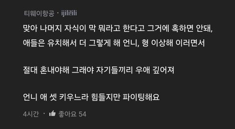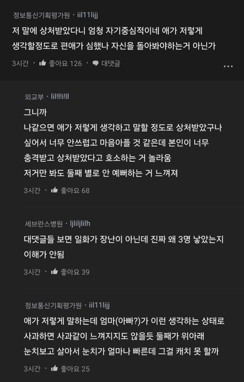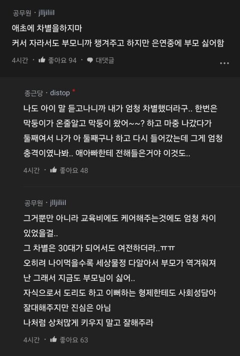 막둥이 왔어~~? 아 둘째구나가 진짜..나도 성인인데 너무 상처다 첫째,셋째는 엄마가 둘째를 개무시 하니까 본인들도 둘째는 개무시해도 되는 존재로 인식해서 원래 이상한애라고 하고 너무 불쌍함