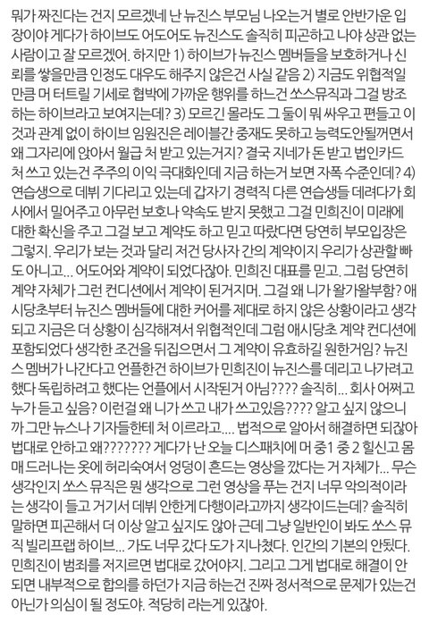 “하이브에 어떻게 내 딸을 맡기고 편히 지낼 수 있을까 생각됩니다. 정확한 사실이 아닌 짜깁기 자료들로 언제 어떻게 괴롭히고 기사를 낼지 모르는데 말입니다.”