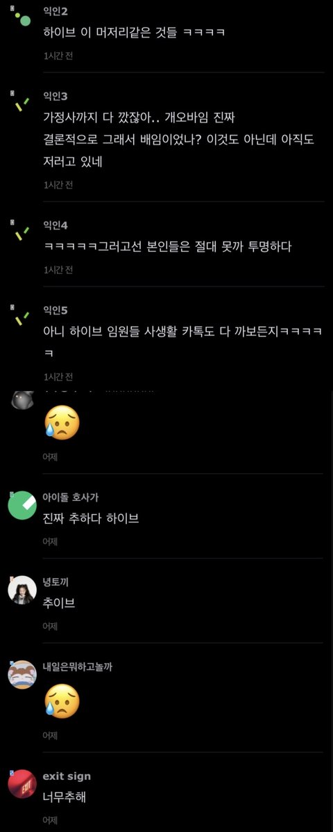 와 .... 진짜 베댓 한번에 싹 갈리네 ㅠㅠ 하이브도 잘하는건 없지만 진짜 버니즈╋슴 쟤네도 뭐 있다고 ㅋㅋㅋㅋㅋㅋ
