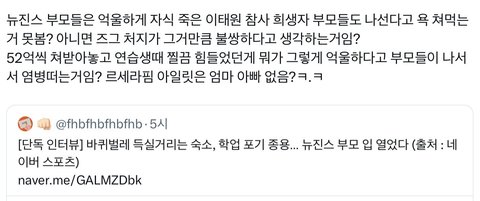 어휴 이태원 참사 유족을 끌어들여 깐다고? 진짜 합퀴 소리 개저씨 소리 들어도 싸다 작작 좀 해 이게 정신 나간거지 뭐가 사이다야 소름끼치네