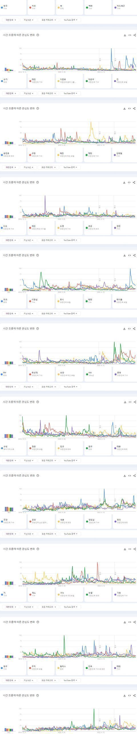 최근 5년간 한국 유튜브에서 가장 많이 검색된 남자아이돌 TOP50
