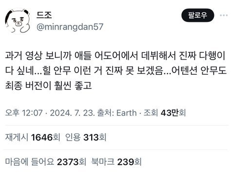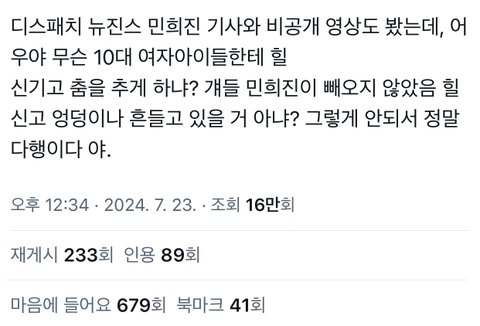 갤저씨들은 하는 일이 일어나자마자 뉴진스랑 팬들 뭐하는지 찾아보는거야? 너네들 취직도 못하고 등골빼먹으면서 사는거 알겠으니까 그만 하셈