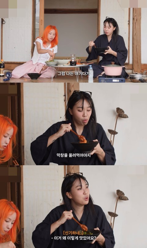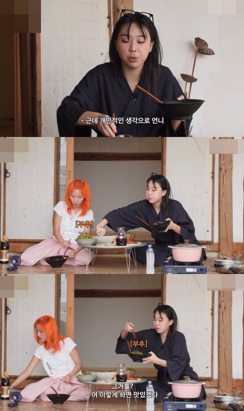 영지는 부추 올려 먹고 소연은 막창 올려 먹음