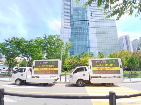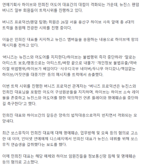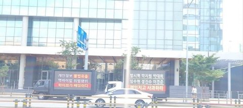하이브 긁혀서 신고 했다고 하던데 트럭 보낸 효과 있네 다음에는 근조화환 보내라