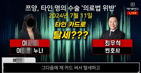 가세연 방송에서 나온 녹취 들어보니까 사망한 쯔양 전남친 친누나가 변호사랑 통화하면서 쯔양이 대리 수술과 탈세를 목적으로 자기의 명의를 빌려서 대리수술하고 탈세까지 했다고 주장했네