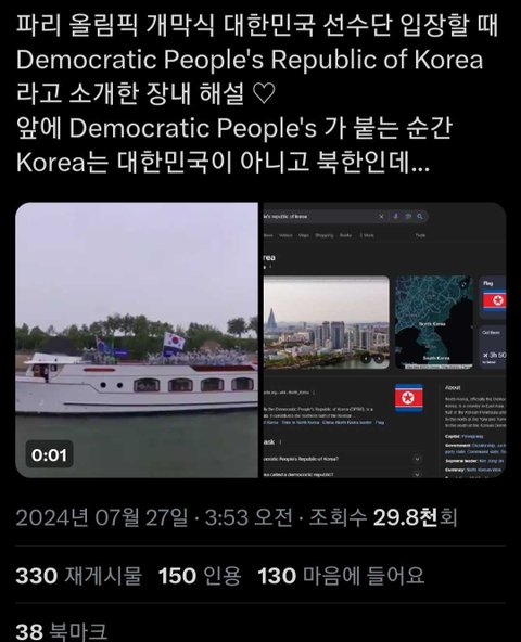 프랑스 파리올림픽에서 프랑스어해설 영어해설 둘 다 남한을 '북한'이라고 소개함ㅋㅋㅋㅋㅋ