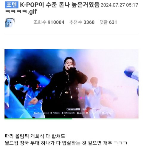 올림픽 개막식 땜에 정국이 월드컵 무대가 재언급되고 있는 글들을 커뮤에서 지나가다 몇개 봤는데 새삼 뿌듯하더라 오랜만에 그때 무대 영상 보고왔는데 지금봐도 최고의 무대임.. 진짜 너무 잘해ㅜ