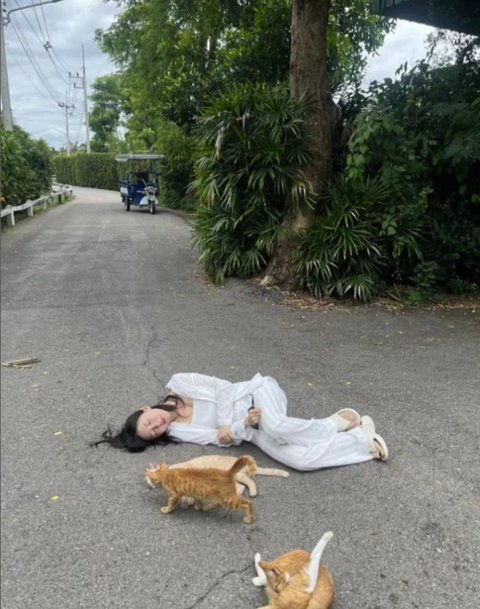 공개된 사진 속에는 상의부터 하의까지 흰색 옷 차림의 주현영이 태국 치앙마이의 한 한적한 도로 위에 벌렁 누워있는 모습이 담겼다. 그의 곁에는 흥미로운 듯 길고양이들이 다가와 있다. 그는 길고양이들과 여러 장난을 치며 시간을 보냈다.