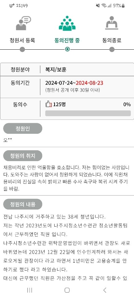 안녕하세요 저는 채용비리로인해 정신적으로 많은 고통과 피해를 입었습니다.이로 인해 저는 정신적인 스트레스를 너무 많이 받아서 아무것도 못하고 있으며 8개월째 일도 못하고 있습니다.제가 원래 3월1일자 출근자였고 이미 합격자이며 예비합격자 였는데 이번에 새로운 관장이 내정자를 정해놓고 아는사람채용하려고 점수를 조작해서 일부러 저를 떨어뜨렸습니다.저는 너무너무 억울해서 못살겠습니다. 이로인하여 제가 국민청원을 올렸습니다. 강력히 요청드리오니 제발 국민청원 동의하기좀 눌러주시기를강력히 요청드립니다. 제발 저좀 살려주세요