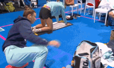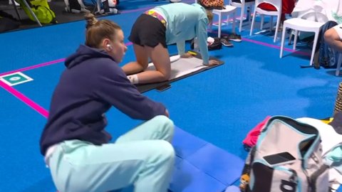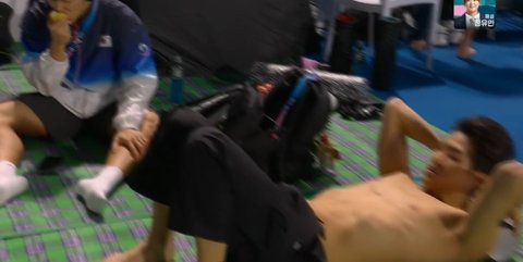 다른 나라 수영 선수들은 개인 매트에서 준비하는 반면,