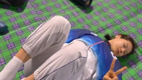누워서 몸 풀다가 카메라 보고 브이~~