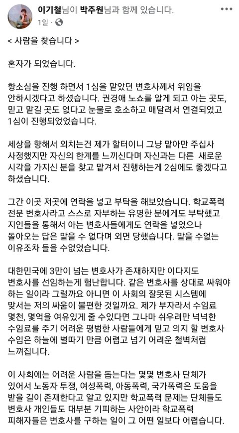 이제 실낱같은 희망인 항소심을 준비해야하는 상황에서 1심을 맡았던 변호사분께서위임을 안하시겠다고 하면서 저희 유가족은 또다시 도움을 청할 곳이 없게 되어버렸습니다.대한민국의 3만이 넘는 변호사를 비롯하여 어려운 이들을 돕는 단체가 있지만학교폭력 문제는 단체들도, 변호사 개인들도 대부분 기피하는 사안인지라저희같은 학교폭력 유가족과 피해자들은 변호사를 구하는 일이그 어떤 일보다 어려운 상황입니다.저희 유가족을 도와주실 분이 계실지, 간절하게 도움을 청해봅니다.다소 두서없고 정리 안된 글이지만 시간내어 읽어주셔서 감사합니다.