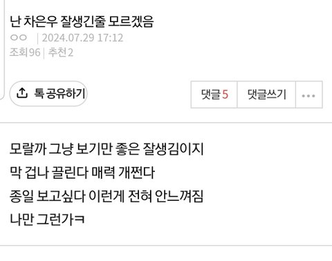 다들 이 위로 댓글 그만쓰셈 몇시간전에 차은우로 똑같은 내용 같은 댓글 도배한 어그로글임 댓×