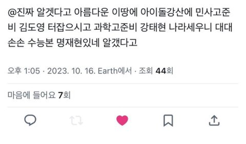ㄱㅌㅎ 중학생때까진 과고 준비생인 거 알고 나서 대단하다고 생각했었는데 내가 고등학생 되고 나니까 그분이 했던 말이 좀 다르게 느껴지더라,,솔직히 지금도 아이돌이면서도 과학과 수학에 재능있고 지적인 본인에 좀 취해있는 것 같은데,,수능 한번 쳐보는 것도 나쁘지 않을 것 같음