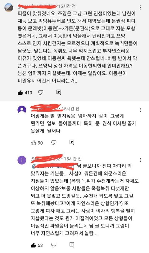 폭행당하던 녹취도 사실 이때싶 아니고 처음 들었을때 저게 뭐임?했음 남자가 쯔양을 가스라이팅 하면서 폭행을 하는 느낌이 아니라 뭔가 억울해서 울분에 복받쳐 깽판치는 느낌인데? 저게 제일 심하다고 생각해 공개했을텐데 뭐지? 싶었거든 솔직히 수천개 다까보라고 하고 싶음