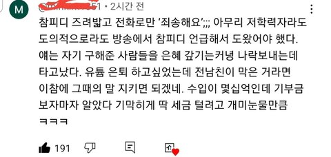 5) 참피디가 쯔양때문에 억울하게 마녀사냥 당했던 일이 밝혀짐 쯔양이 복귀 성공한 후에도 참피디의 여론을 바꿔줄 노력조차 안함 커뮤에 사과글 한줄 써주는게 힘든거?