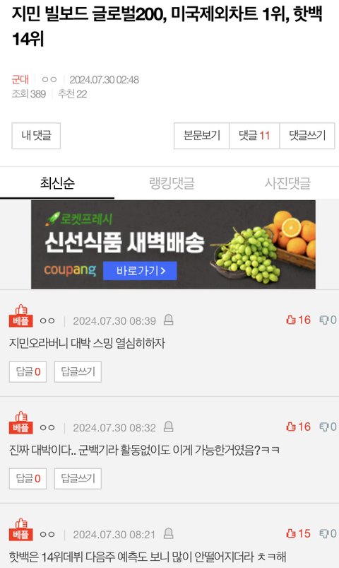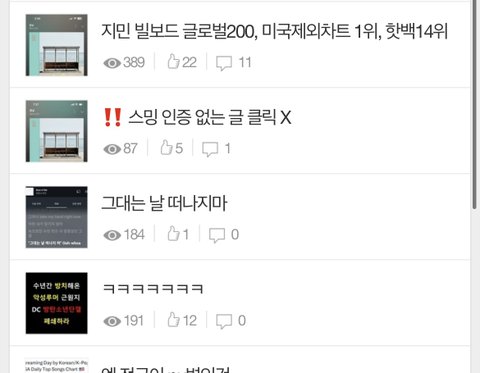 지민이 방탄멤버고 축하일 있으니 축하하는데 왜 문제인거야? 타멤버들도 좋은 일있으면 항상 글 올라왔던곳이야 사실 지민이 글은 지금 앨범냈으니 올라오는건데 그냥 지민이 글이 올라오는게 싫다는 거야? 정국이 활동한때도 여기 정국이 글 몇 달 계속 혼자 올라왔던 곳인데 지민글에 비추 찍으면서 할 이유가 뭐가 있어? 먹금하고 지켜 보고 있는데 여기 도배 너무 심하잖아 지민이좋아하면 모두 악개라는 심리인거야? 지민이도 방탄이다