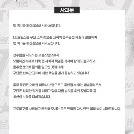 구단은 "진심으로 사과드린다"라며 "선수들을 지도하는 코치는 사회적 책임감을 가져야 하는데도 음주운전으로 물의를 일으켰다"며 "구단은 선수단 관리에 관한 책임을 깊게 통감한다"고 밝혔다.