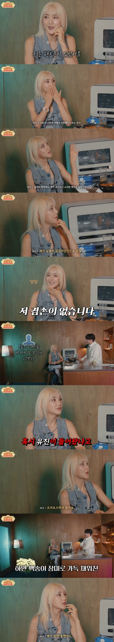 바다는 "솔직히 화면에는 제가 유진이나 슈처럼 예쁘진 않았지만, 제가 실물이 최강이었다 사실"이라며 "저 겸손이 없다"고 자신만만해했다.