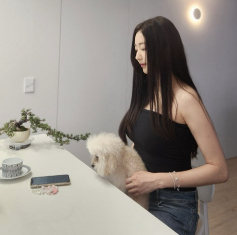 공개된 사진 속에서 김사랑은 반려견을 안고 식탁 앞에 앉아 있었다. 늘어뜨린 긴 생머리 사이로 보이는 오똑한 콧날과 갸름한 턱선이 김사랑의 여전한 미모를 뽐냈다.