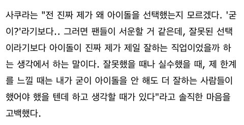 잘못했을때나 실수했을때, 한계를 느낄때는 내가 굳이 아이돌을 안해도 더 잘하는 사람들이 했어야 했을텐데 하고 생각할때가 있다??? 그 실력에 그 위치면 한계를 느낄때 연습해야겠다는 생각이 제일 먼저 들어야 하지 않냐? 와 진짜 이런마인드는 처음봄 ㄹㅇ