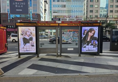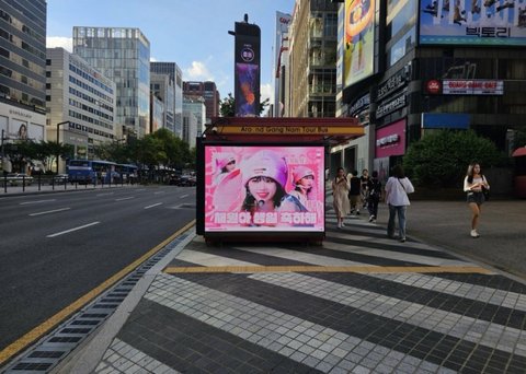 정류장에 뉴욕 타임스퀘어 광고를 때리는데