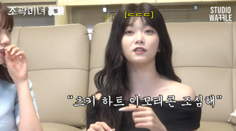 이에 츠키는 지예은의 손목을 붙잡으며 "저 그거 한국에서 배웠다. 그걸로 주의 받았다. '하트 이모티콘 조심해'(라고)"라 고백했다.