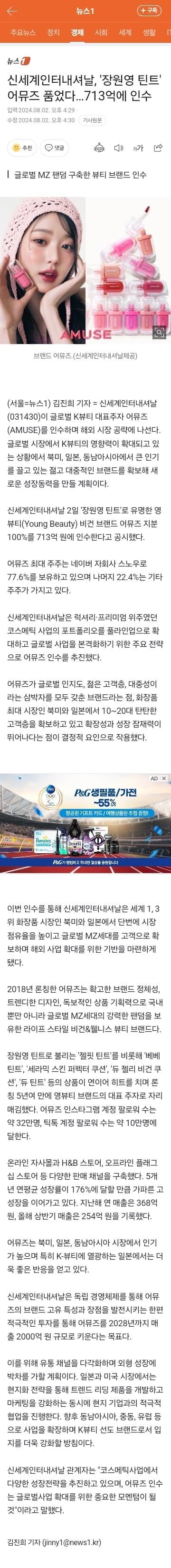 장원영 모델되고 대박나서 신세계에 700억 넘게 인수됨ㄷㄷ