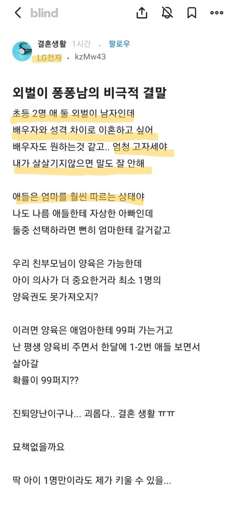 외벌이인데도 와이프가 이혼하자 할 정도면 경제적으로 궁핍해지더라도 더는 못 살겠다는 거임 그리고 애 키워보면 알겠지만 육아는 시간보다 질이라서 아빠가 저녁에 잠깐 놀아주면 종일 숙제해라 청소해라 잔소리하는 엄마보다 아빠 좋아함 가정에 ㅈㄴ 소홀했고 유책사유 있는 놈이 퐁퐁 코스프레 하는거지