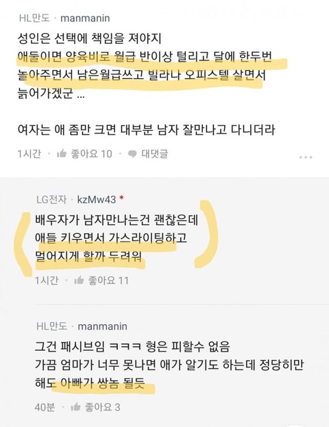 ㅋㅋㅋㅋㅋ남자들 돈만번다고 아무것도 안하면 자업자득이지.. 물론 등골빼먹는 여자도 있는거 맞음. 근데 자기혼자 돈번다고 퇴근후에는 육아 집안일 다 안하려고 하는 새끼들도 널림.. 평일이 힘들면 주말에라도 하던가 또 출근전이라고 누워있기만함.. 아버지 외벌이로 3교대 근무해도 놀러갈려고 해 엄마 아프면 본인이 밥은 못해도 엄마 쉬라거 애들 밥은 챙겨먹였는데 요즘 남자들은 주5일 애하나랑도 애 편할때만 놀려고 하니까 문제
