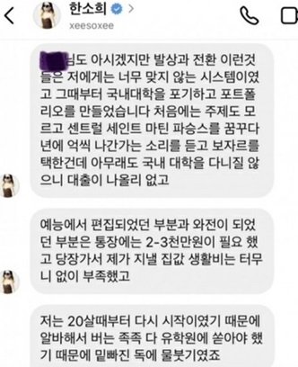 해당 누리꾼에게 보낸 메시지에서 한소희는 "처음에는 주제도 모르고 센트럴 세인트 마틴, 파슨스를 꿈꾸다 연에 억씩 나간다는 소리를 듣고 보자르를 택한 건데 아무래도 국내 대학을 다니지 않으니 대출이 나올 리 없고"라며 "예능에서 편집되었던 부분과 와전이 되었던 부분은 통장에는 2~3천만 원이 필요했고 당장 가서 제가 지낼 집값 생활비는 터무니없이 부족했다"고 해명했다.