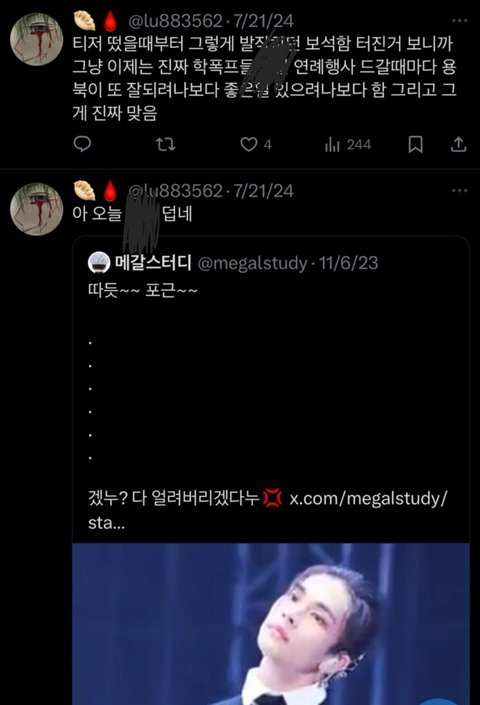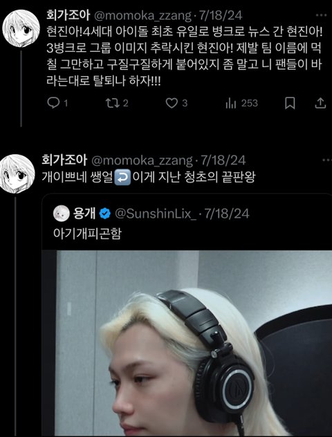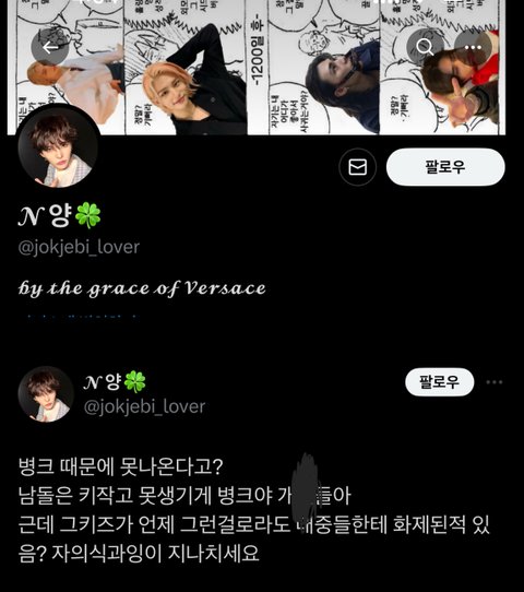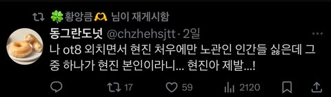 트위터에 가보니깐 현진이랑 용복이 악개들이 유독 너무 심한거 같더라ㅠㅠ아주 가관이던데..?정작 현실에서는 현진이랑 용복이 서로 가족처럼 친하고 둘다 남자애들한테도 인기많고 둘다 팬들도 많은데 지능이 떨어지는 악개들만 황프인척,뽁프인척 하면서 추하게 현진이랑 용복이를 까고 이젠 성희롱까지 하고있음ㅉ